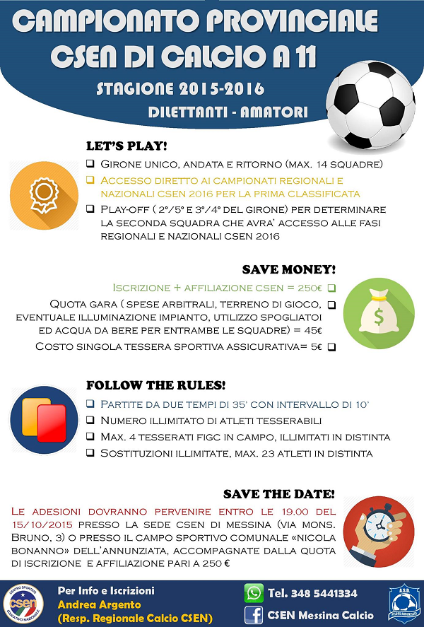 Per info e iscrizioni contattare, al 3485441334, il Responsabile Provinciale CSEN, Settore Calcio, Andrea Argento.