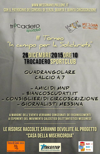 L’evento, patrocinato dai Consigli di Terza, Quarta e Quinta Circoscrizione, si svolgerà sabato 26 dicembre alle ore 10 al centro sportivo “Trocadero” di via Consolare Pompea (Pace), dove si sfideranno, in un quadrangolare di calcio a 7, le formazioni “Giornalisti Messina”, “Biancoscudati.it”, “Consiglieri di Circoscrizione” e “Amici di Mnp” in minigare da 40 minuti. Sarà possibile partecipare devolvendo delle somme in denaro oppure donando dei beni alimentari che, allo stesso modo, saranno consegnati ai volontari della casa.