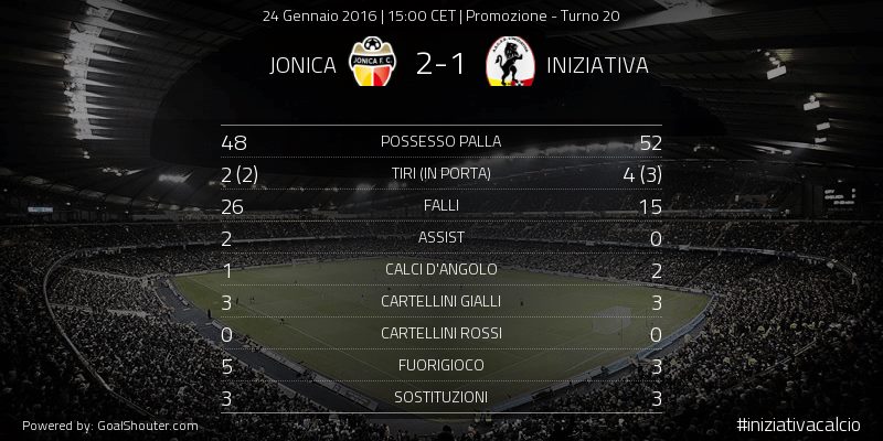 La gara: Il risultato si sblocca dopo appena 4’. L’undici di Moschella colpisce di rimessa, quando dall’out di destra parte un pallone ribattuto dalla difesa ospite. Sul lato opposto Smiroldo aggancia in area di rigore e, con il destro, insacca alle spalle di Bucca, che si stende in tuffo ma non può arrivare sulla conclusione diretta all’angolino. Ma, a distanza di due minuti, L’Iniziativa capitola una seconda volta. E’ Loria ad inserirsi in area e concludere, con l’immediata respinta di Bucca. Sulla sfera c’è stavolta Maggioloti, che non sbaglia il più semplice tap-in sottomisura. 2-0.